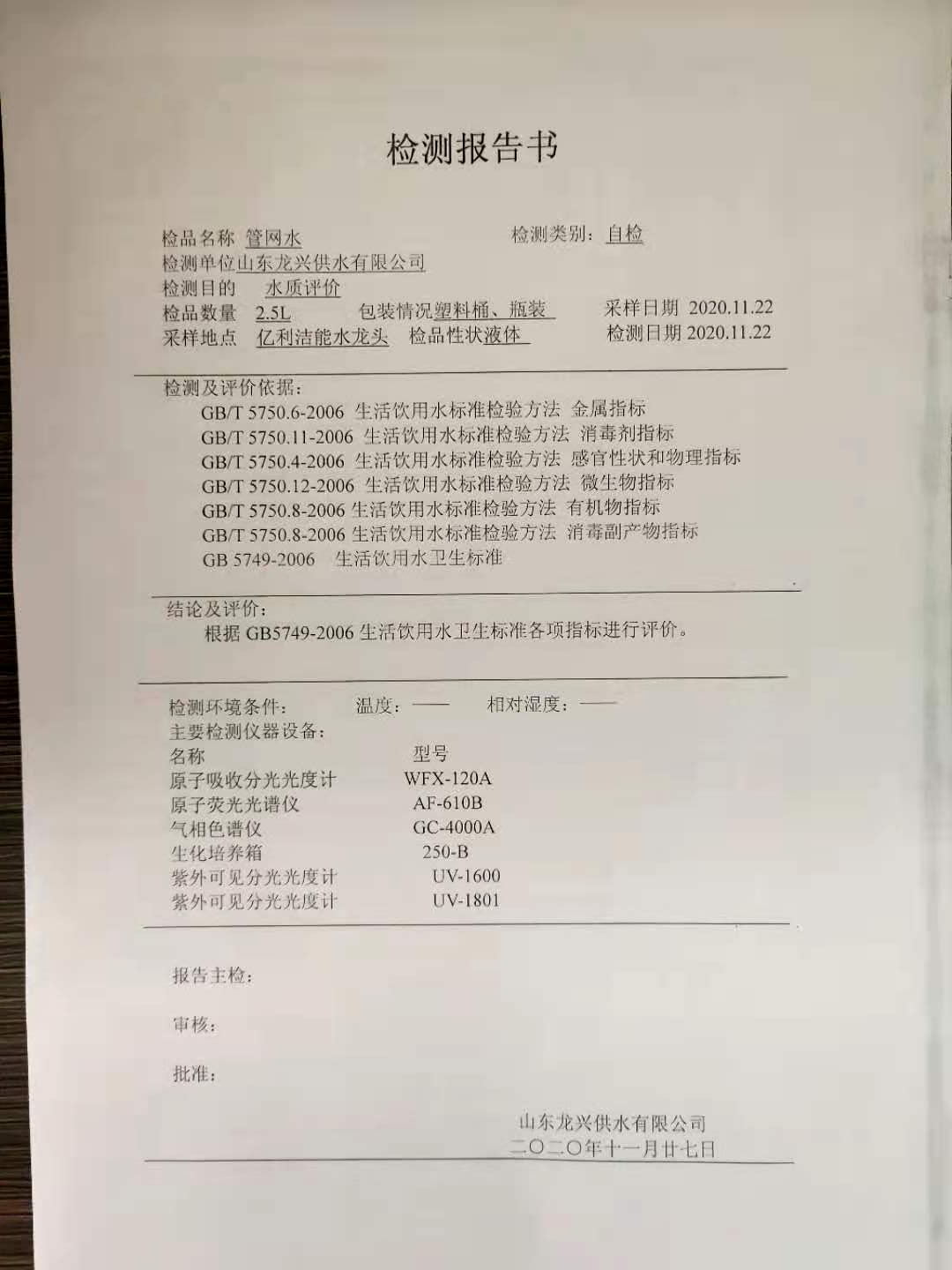 2020年11月管網水月檢報告